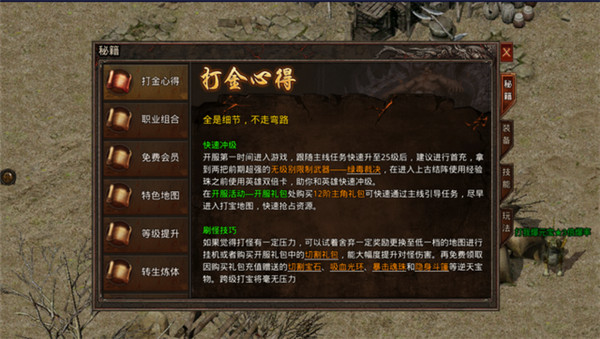 1、散人无双的前期升级主要还是以任务为主。在出生地新来手村附近先接任务,然后按照任务打怪交任务升级,主线、支线任务可以提供大量的经验。2、中期阶段升级的时候适当的高级怪物有牛魔洞的怪物、骨魔洞的怪物、虹膜殿的怪物这些都是非常适合升级的地方,这里的怪物等级略高,密度不算很大,而且时不时的能够产出一些好东西,比如说牛魔洞的牛魔将军出祖玛级武器,虹膜殿里的白野猪出沃玛级的首饰等等。