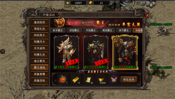 第一天的玩家,最好先开通个VIP7,前期快速冲击VIP7,再激活个狂暴之力,即可新增三个地图,每个地图怪物的种类都很多,掉落各阶装备的都有,提前开启哪怕打不过一些高级的霸主,也可以去挑战一些练气境的霸主,且地图限制下,只有激活狂暴之力的玩家才能进入,击杀狂暴之力的玩家是有奖励的哦。