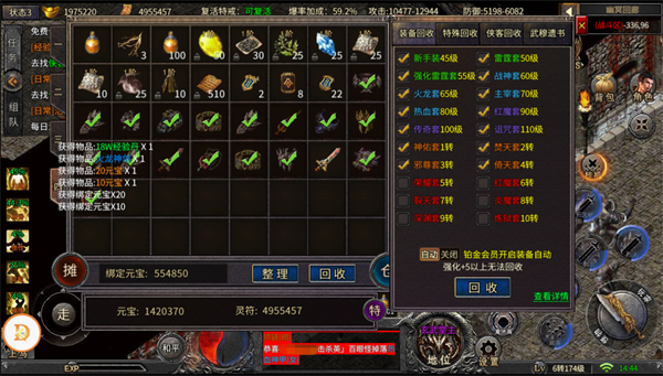 装备回收:打到多余的装备可以回收获得元宝奖励!
