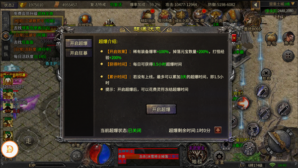 开启超暴:可以增加100%稀有装备爆率,200%元宝掉率和200%的经验获取