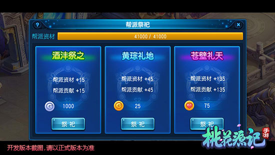 3、帮派祭祀:每天可祭祀一次,有三种祭祀类型可选,第一种酒沣祭之需要1000银子,第二种黄琮礼地需要25金子,以及苍壁礼天需要75桃心,祭祀后会获得相应的帮贡。