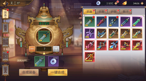 1、装备合成装备合成需要3个相同装备与银两,在玩家拥有足够的道具和货币后,可以向上合成。