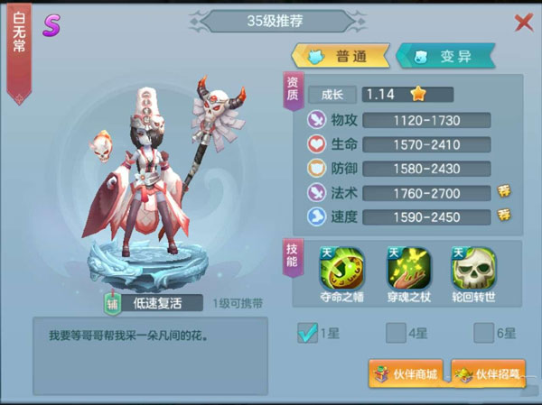 第三个黑无常,为什么说这个呢,因为除了,小龙女,猪八戒,这俩SS,别的前期想抽SS除了10连得花钱的,平民想抽只能用元宝一次一次抽,那就是看脸的了……毕竟前期你不能用系统送的A吧,而且游戏元宝很好赚的,黑无常有一个技能很不错,就是轮回转世,死亡一回合后复活,也算是一个不错的技能了!
