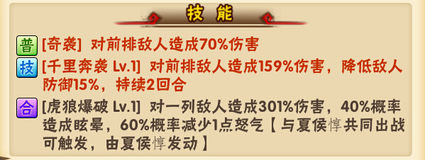 虎狼爆破:对一列敌人造成301%伤害,40%概率造成眩晕,60%概率减少1点怒气(与夏侯惇共同出战可触发,由夏侯惇发动)
