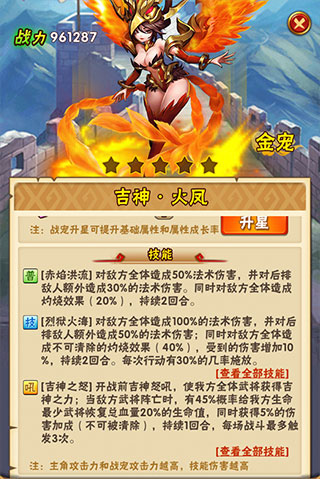 火神·祝融出战属性为全体伤害加成。火神·祝融是攻击宠物,比较适合护佑·主将,更大限度的发挥主将的实力。
