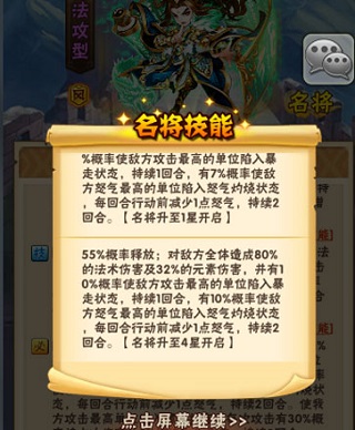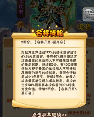 3、概率释放技能全体法伤,低概率使敌方攻击最高单位陷入暴走状态,低概率陷入怒气灼烧状态,每回合行动前减少1点怒气。