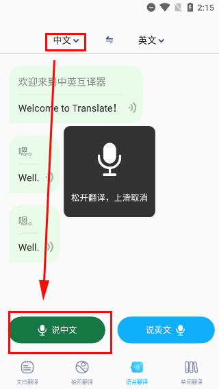 3、语言翻译下,我们可通过切换上方更换直接所输入的语种,按住下方录音即可开始,待将话都说完后松开即可开始翻译