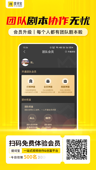 下载打开APP,登录后点击首页上方“团队剧本”,再点击右边的小加号进入,点新建团队,开通团队会员,选择套餐后,即可开通。
