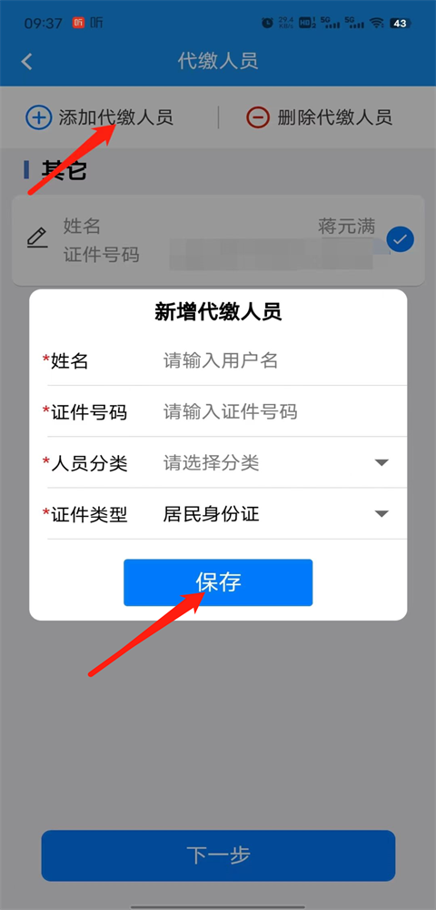 3、小编在此就以代缴为例,输入代缴人员的相关信息,点击下一步。