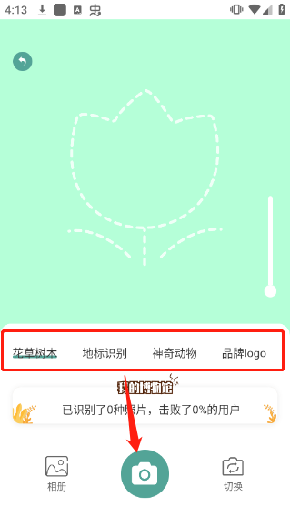扫一扫功能主要通过不同引擎识别具体花朵,我们可在下图所示位置切换如“花草树木”、“地标”、“动物”等各项引擎