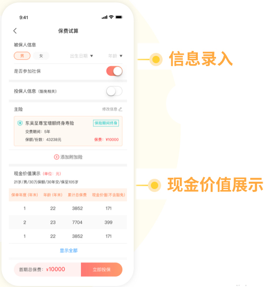 更改信息实时计算保费,便于快速调整信息获得反馈。增加现金价值演示表,现金价值一目了然。