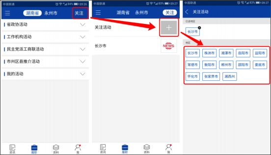 (1)点击履职页面右上角的“关注”文字按钮,进入关注栏目页面;