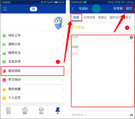 进入“提交资料”栏目,选择“社情民意”选项卡,根据页面提醒进行社情民意的提交。
