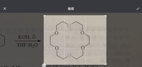 拍照时尽量保持图片清晰和平整,以保证识别的准确性。拍照后对照片进行裁剪,保留完整、清晰的结构式后点击确认,相应的结构式就会提取到KingDraw的画板上。