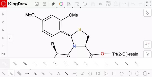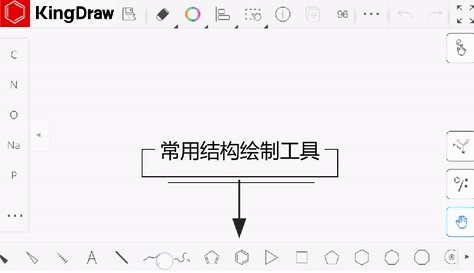 在KingDraw APP中,常用的结构式绘制工具都集中在画板的下功能区,工具栏支持左右滑动和隐藏。