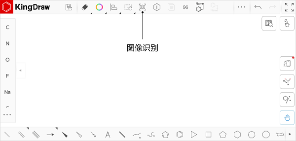 在手机端打开KingDraw,新建画板后,我们就可以在画板的上方找到“图像识别”按钮,开启相机拍摄权限后,就可以对印刷源上的结构式进行拍照。
