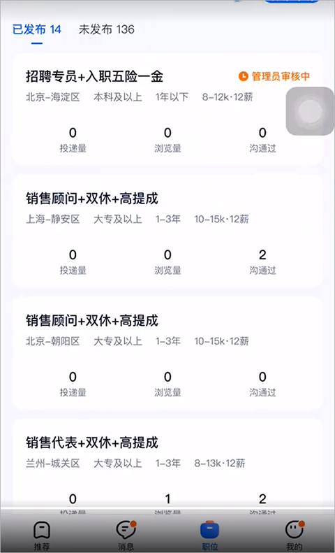 1、首先用户可以前往职位页面中查看职位是否通过审核,如果职位没有被平台审核是不能够进行职位刷新的