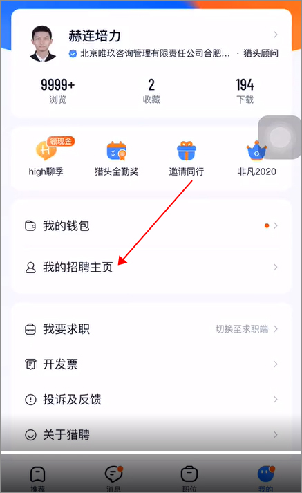用户可以在我的页面中点击【我的招聘主页】中进行查看