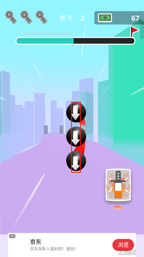 7、碰到这种类型的障碍物,玩家只需要根据白色箭头,手指下滑即可成功切碎;