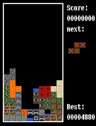 TetrisM我的世界版是将我的世界与俄罗斯方块相结合而成的一款游戏,这款游戏继承了我的世界经典的沙盒像素风格,打造出了与众不同的画面感,并且游戏中所有的方块都是用我的世界中的各种矿石制作而成,同时还有各种游戏特效,例如水会流淌,有时还会结成黑曜石,木头会长出叶子等,非常独特。此外,这款TetrisM我的世界版的游戏玩法还是俄罗斯方块的经典玩法,玩家在这里需要通过左右移动,上下翻转的方式来自由放置各种形状的方块,并想办法把它们一行行填满消除,另外随着游戏的进展,不仅会增加游戏难度还会加快方块下落速度,因此玩家需要灵活变换方块的形状哦,那么感兴趣的话就来下来试试吧!