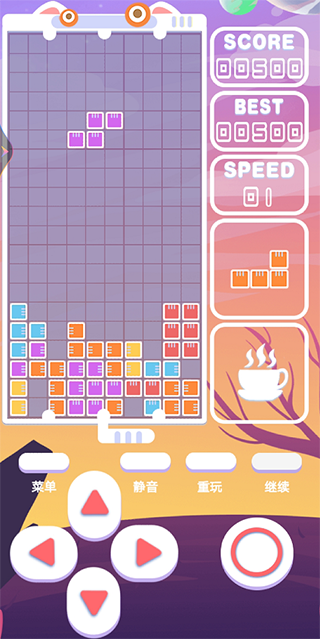 2、游戏操作方式:左下方为操纵方块行动方向,右下方圆形键为操纵方块自身转动方向,右侧边显示得分和下一回出行的方块类型;