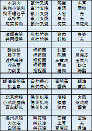 以上就是舌尖上的美食梦全部的美食宝图啦,值得注意的是图中上半部分诸如“清蒸鱼”、“木须肉”、“担担面”等菜品可以开发出许多新菜,优先入手此类菜品就可以快速扩充菜单哦。