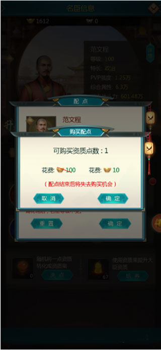 1、每个大臣的配点阶段都有三次,分别为100级、120级、150级,在这三个阶段玩家都要给大臣进行配点,配点建议玩家先加军略方面,这样玩家在军事方面的胜算会大一些,其他方面的就根据自身而定,配点加好了能大幅度的提升国力。