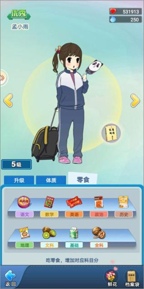 考虑到前期考试时,只能一人考试且需要满足相应分数才能三星通关的特点,建议新手期通用零食来培养学生最优单科成绩为主,单科高分追求考试的迅速通关。