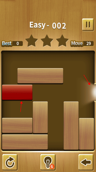 3、第一关会有小手进行操作指引,通过上下移动木板,将红颜色的木板移动到出口出去,就可以通关啦!这时候再开始第二关就非常简单了。