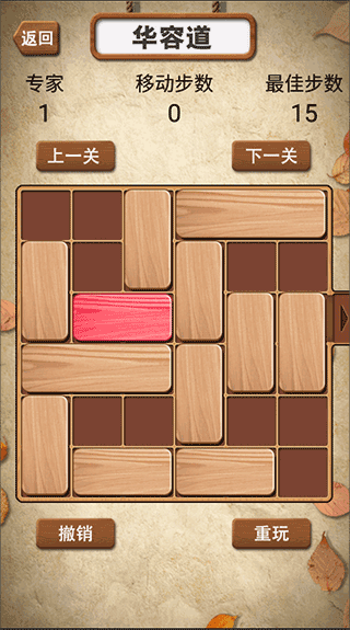华容道积木拼图是一款非常考验技巧和思维能力的益智类游戏,玩家需要设法用最少的步数,通过移动木块来实现让红色木块成功到达出口。游戏针对不同的玩家设计有不同的难度,在这些难度中,玩家可以随心所欲的选择关卡,可以在挑战完后重新再体验一番。田 外游戏的画风讨喜,带有木纹配色的整体风格让整个游戏的意境添色不少,喜欢这种游戏的玩家可以快来下载这款好玩的游戏了。