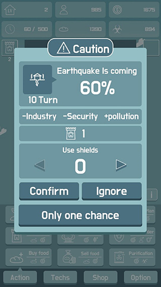 操作简单,但要应对各种随机出现的灾难,比如地震或台风什么的。为了防止受灾太久,最好多准备防护膜,像如果灾难需要7层防护,用满7层就完全免疫了。游戏背景是逃离地球找新地方重建家园,听起来还挺有科幻感的。