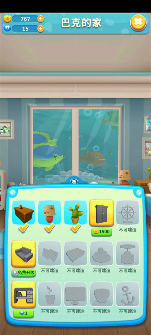 5、点击建造,即可装饰巴克的家,每建造一个建筑物品,所得的分数即可获得加成。