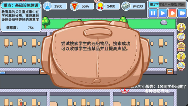 2、打开书包搜索学生的违禁物品并没收,没收后可提高学校纪律和声望;
