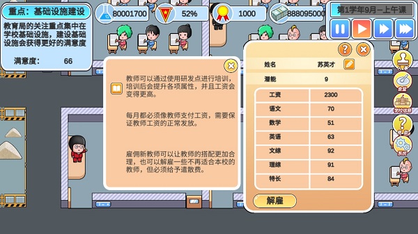 金钱表示学校的可用资金,可以用于维持教师工资,建造建筑物等用途,可以通过食堂和小卖部销售来招收择校生来获得。