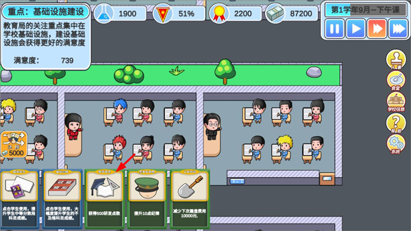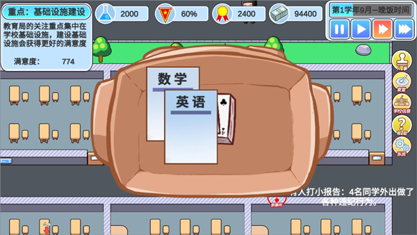 游戏里还有卡牌系统,可以用来降低建设成本或赢得竞赛,这让游戏更有策略性。作为校长,你还需要关注学校的基础设施、威望和纪律等指标,通过提升这些来获得更好的发展。比如建设更多的设施能提高学生满意度,而高威望能让学校晋升到更高的等级。