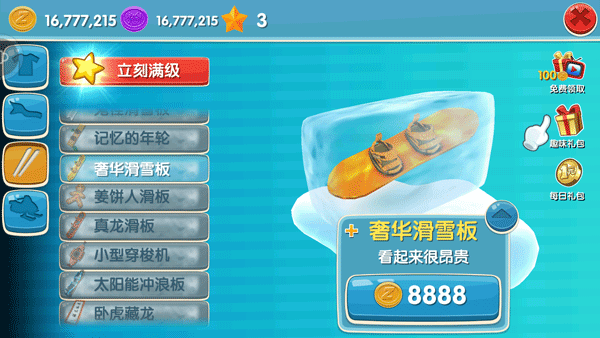 不过有些高级装备要花游戏币买,比如黄金围巾和滑雪板,价格有点小贵,但整体体验还是挺值的。总之,这是一款适合全家人一起玩的游戏,既刺激又有趣,强烈推荐!