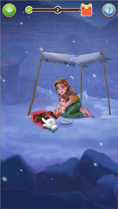 2、玩家根据游戏提示三消合成靴子、火堆、房子等帮助这位母亲;