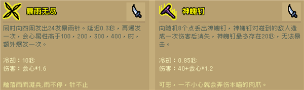 升级学减物理cd,这样每次攒满梨花钉一把吃掉的话,最高能给2000左右的属性,到游戏后期会心甚至能达到10000以上,暴雨针一发打100万。详细看下图: