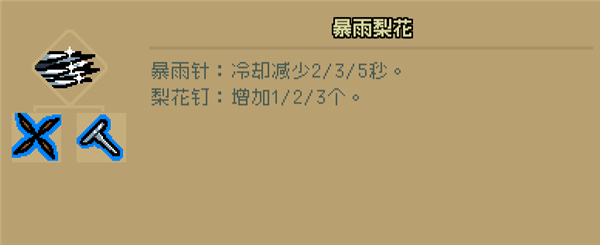 梨花钉可以被主动技能吃掉,而且cd很短,后期暴雨针在高会心的影响下输出很可观。