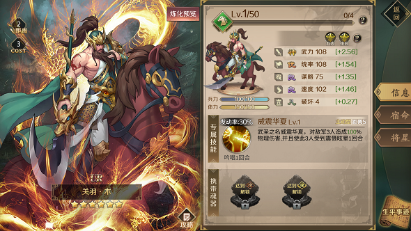 魂器是战斗中的重要元素,分为被动型、主动型、连携型和队伍型。被动型提供属性加成,而主动型在战斗中触发技能。队伍型魂器则在战前准备阶段生效。英灵如姜维拥有高武力和谋略双成长,适合前期开荒。