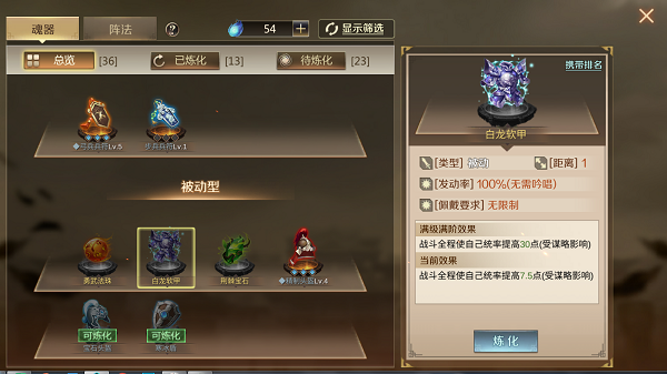 首先各位主公要知道魂器在游戏中是十分重要的战斗元素,魂器主要分为:主动型、被动型、连携型、队伍型被动魂器:被动类魂器带在身上大部分是给卡牌本身加成属性,很好理解。但是一个细节要注意。被动类魂器也是要在战斗过程当中才能体现出效果的,就算你带上被动加速度的魂器,也不能让你在大地图上跑得更快。