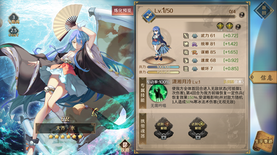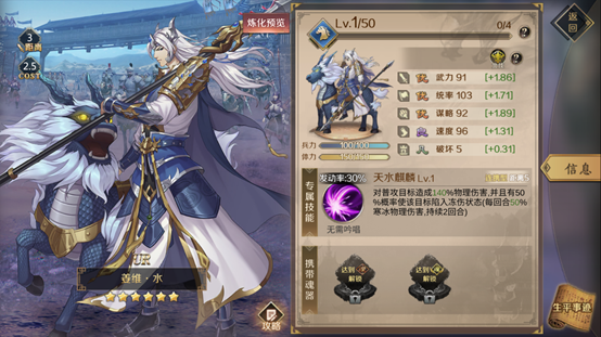 专属技能:天水麒麟Lv1,对普攻目标造成层140%物理伤害,并且有50%概率是该目标陷入冻伤状态(每回合50%寒冰物理伤害,持续2回合)