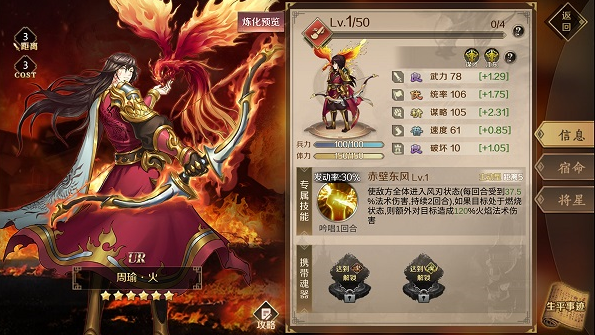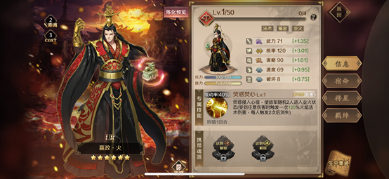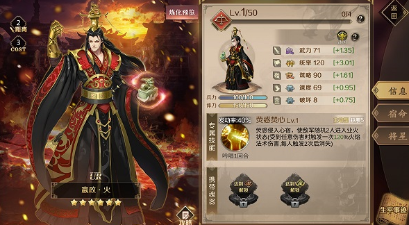 专属技能:荧惑焚心Lv1,荧惑侵入心宿,使敌军随机2人进入业火状态(受到任意伤害时触发一次120%火焰法术伤害,没人触发2次后消失)