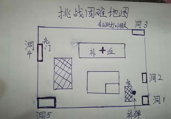 不会打困难的先了解困难的平面图,入口3,4,5都会出飞机怪,飞机怪是不懂打困难的噩梦,所以,我们的主要目标是守住1和2两个口,让火力强的守3,4,5。(平面图献上,画的不好别介意)