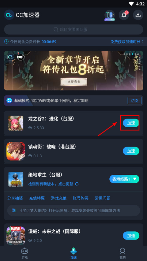 1、在本站下载龙之谷2进化官方版,然后打开CC加速器,找到游戏加速启动;