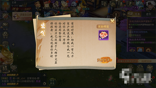 在完成考验之后,这个密笺的任务接取方式是有一些设定的。第一种接取方式就是和奇遇是有一点类似的,在任务界面中会出现密笺任务。而这个方式也是相对简单的,玩家只要在界面中按照密笺任务的要求来进行操作即可。