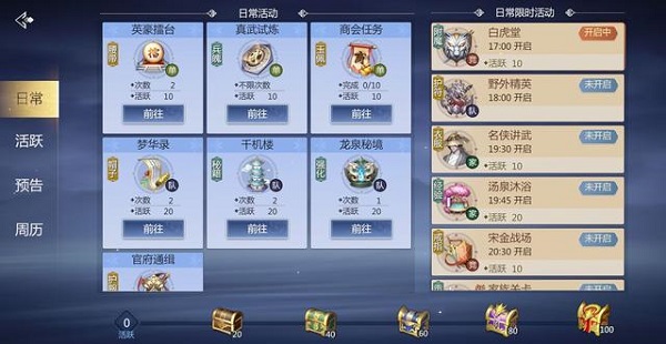 2、通过参与商会任务、英豪擂台、真武试炼境等活动,每日达成满活跃状态,可获得丰富奖励记大量经验。