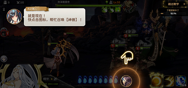 4、我们有三个角色可以选择,每个角色技能属性和在团队中的作用都有所不同,点击光之瑞儿可以帮忙召唤神兽来打击敌人;