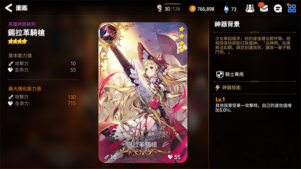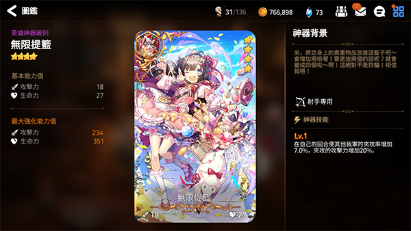 神器的属性分为了两个方面,一个是基础属性,另外一个是特殊技能。在对神器进行升级之后,可以提升这些属性。当达到等级上线之后,需要对其进行突破后才能继续进行升级。