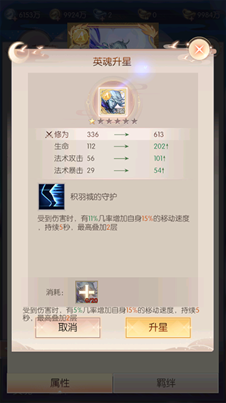 英魂升星:消耗英魂对应的碎片,可以提升英魂星级,英魂升星可以提升英魂属性,拥有主位技能的英魂还能提升其技能效果,英魂最多可升至6★。